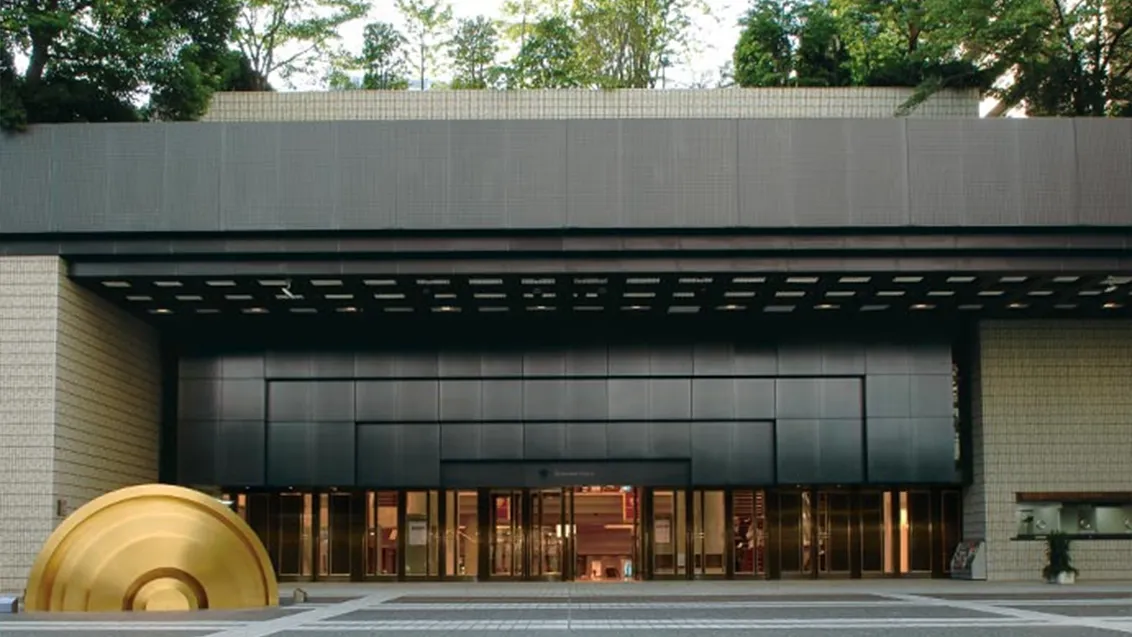 エントランス前には「響」をテーマにした金色のモニュメントがあります。響きの広がりを彷彿とさせる半円が並べられています。作者は、サントリーホールのシンボルマークもてがけた世界的グラフィック・デザイナー、彫刻家の五十嵐威暢氏。このモニュメントの設置面(底面)は、シンボルマーク「響」の形になっています。