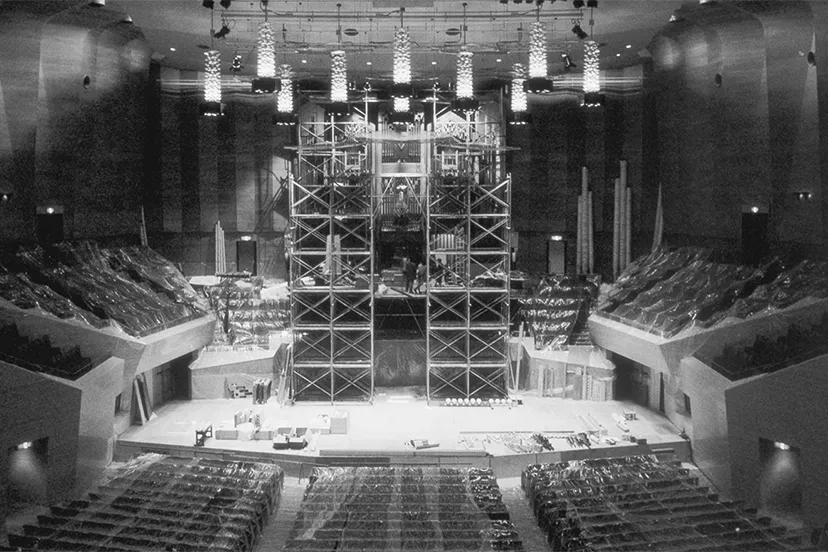 1983年、佐治敬三は、佐野氏らと共に欧米の著名なコンサートホールを視察。ベルリンでは、世界で初めてヴィンヤード型に設計された、ベルリン・フィルハーモニー管弦楽団の本拠地「フィルハーモニー」を訪問。建設に深く関わったカラヤン氏に、意見を問うたのです。答えは明快でした。「コンサートは舞台上の演奏家と聴衆が一体となってつくりだすもの。ステージを中央に配置し、その周りを客席がぐるりと囲んで、皆で音楽をつくっている雰囲気ができあがるヴィンヤード型こそ、ふさわしい」。さらに、「段々畑に太陽が降り注ぐように、段々に配された客席のどの場所にも等しく音楽が響く」という理念に、佐治敬三は深く共感し、サントリーホールの形式を確定しました。