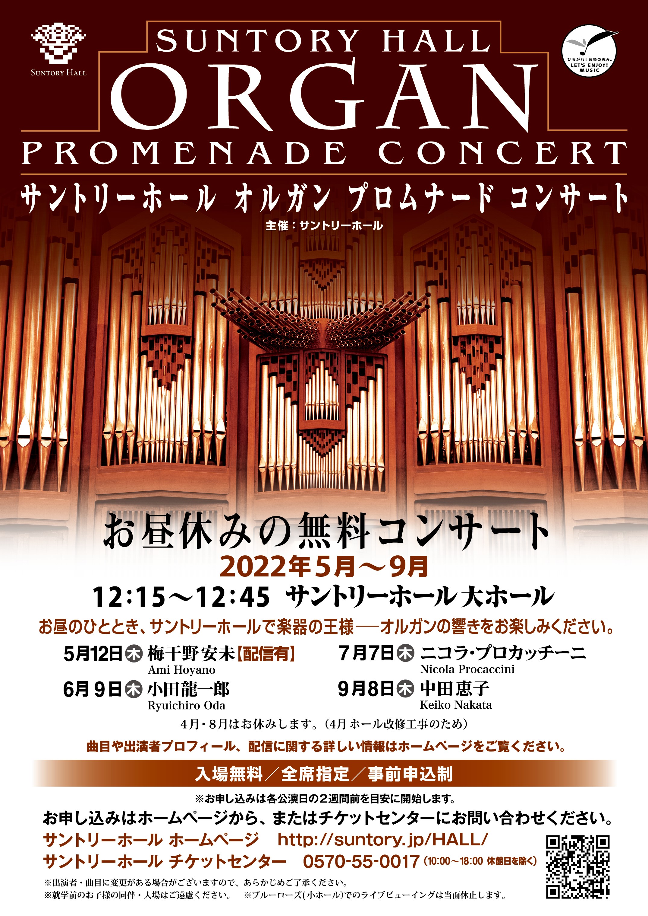 本プログラムは、ペンテコステ(聖霊降臨の主日:今年は6月5日)のコラールがペダルで堂々と奏されるJ. S. バッハ(1685~1750)の重厚絢爛な「『来れ、聖霊よ』によるファンタジア」 BWV 651で幕を開けます。 続いて、オルガニスト、作曲家として活躍したジークフリート・カルク゠エーレルト(1877~1933)の作品を3曲演奏します。最初が「わが頼みなるイエスは」、次に甘美な和声が特徴的な「身を飾れ、おお愛する魂よ」、そして目まぐるしく変化する調性とペダルの動きが華々しい『ロンド・アラ・カンパネッラ』です。彼がオルガンをコンサート楽器として捉えてその可能性を追求していたことがこれらの作品からうかがえます。 ついで、聖餐式の神秘を描いたオリヴィエ・メシアン(1908~92)の最初期のオルガン作品である『天上の宴』では、本ホールの残響と大オルガンが備えている多様な音色が混じり合って、宇宙に広がるような奥行きが形づくられます。 最後はペトル・エベン(1929~2007)が1964年に作曲した『讃歌』から第3曲「ファンタスティコ」を演奏します。駆け上がる音階によって区切られるこの曲では、『天上の宴』と同じく聖餐式の秘跡を歌ったグレゴリオ聖歌「シオンをたたえよ」がモチーフとして繰り返され、最後は即興的に駆け巡る壮麗なトランペットのフレーズを経て終わります。 本プログラムはこのように、カルク゠エーレルトの『ロンド・アラ・カンパネッラ』を中央に置いて、祈りの曲を対称的に配したものとなっております。 (小田龍一郎)