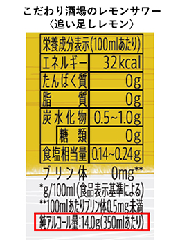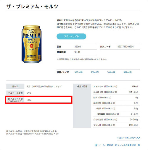 酒類製品に含まれるアルコール量をお客様に分かりやすくお伝えするため、国内で販売する主要な酒類製品に含まれる純アルコール量を、サントリーホームページで開示しています。また2022年2月以降、缶商品に1缶あたりの純アルコール量(g)を表示しています(対象商品は、国内製造の缶商品(ビール類、RTD、ワイン))。