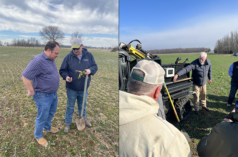 (左)農家の方とカバークロップの検証を実施。(右)畑から土壌のサンプルを採取し、水の保水や土壌中の有機炭素の状況を調べたうえで、GHG削減のためにどのような改善策が考えられるかを農家の方々に説明しています。