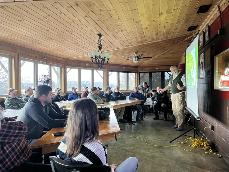 アグロノミストが、実証プログラムに参加している農家にカバークロップなどの施策を通じたGHG削減の成果を共有している様子。