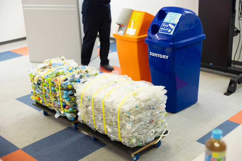 サントリーグループでは、2030年までにグループで使用するすべてのペットボトルを、リサイクル素材や植物由来素材等100%に切り替え、化石由来原料の新規使用をゼロにする目標を掲げています。