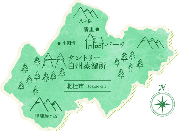「白州のフレーバーは、まさにオンリーワンです。海を感じさせるシングルモルトウイスキーは多いのですが、口にした途端、ダイレクトに森が思い浮かぶウイスキーは世界中探しても白州以外にありません。ミントや青りんごの爽やかな香りも感じられる白州こそ、豊かな森に恵まれたこの地で飲むのにふさわしいと思います。さらに、食事の後にゆったりと飲むなら、白州12年(休売中)や白州18年を試してみるのはいかがですか。複雑で繊細な香りを時間をかけて変化させながら愉しめる熟成した白州は、長い夜のお供に向いていますよ」