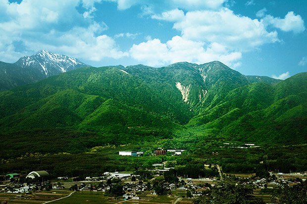 中央に見えるのが白州蒸溜所。山麓の扇状地にあることがよくわかります。