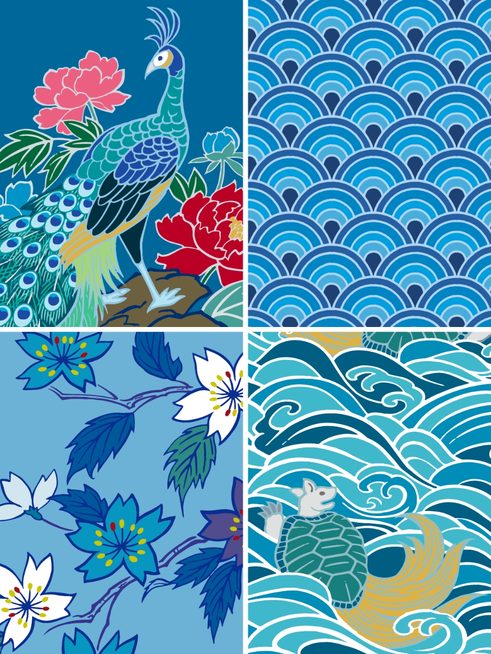 絢爛たる孔雀牡丹は、繁栄や冨貴を象徴しています。平和の永続を願う青海波や長寿吉祥をもたらすとされる亀甲など、縁起の良い意匠を贅沢にあしらいました。