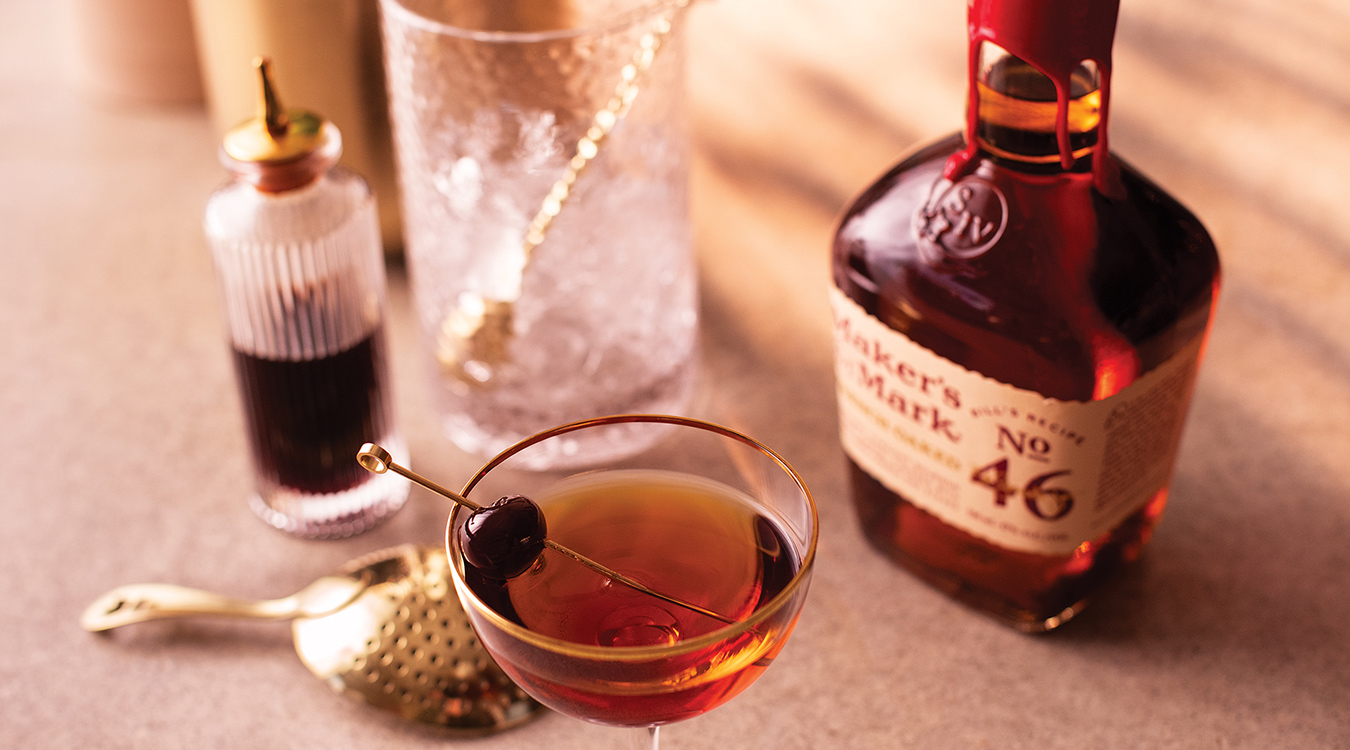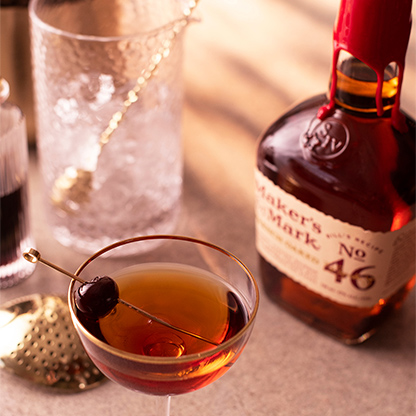 世界で最も有名なカクテルのひとつ「マンハッタン」。ウイスキーとスイートベルモットのまろやかで甘みのある組み合わせに、ビターズのハーバルなアクセントがきいた、まさに“カクテルの女王”の名に相応しいカクテルです。定番のカクテルであると同時に、世界中で様々なアレンジをきかせたバリエーションも愉しまれています。より深く甘い味わいのメーカーズマーク46を使用することで、奥行のある味わいが愉しめます。