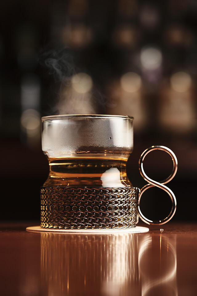 「熱が少し冷めた、グラス上部の曇りがゆるんだくらいが美味しいかもしれません。アイリッシュのピーテッド・シングルモルト、カネマラのお湯割です」
