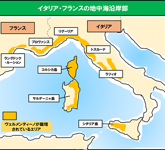 ジャンシス ロビンソンMW著の「WINE GRAPES」によると、ヴェルメンティーノは13~14世紀にコルシカ島で栽培されていたと言われています。サルデーニャ島には、このぶどうはスペインから伝えられた(14~17世紀にはこの島はカタルーニャの支配下にあったので)という言い伝えがあったり、ギリシャや中近東から伝わったという話もあったようですが、DNA鑑定の結果からそれを裏付ける証拠は見つかっていません。初めて文献に登場するのが、ピエモンテ州で栽培されていたという1658年の記録。コルシカ島とピエモンテ州はリグリア海を挟んで向かい合った位置関係ですから、コルシカ、リグーリア、トスカーナ、プロヴァンスを結ぶ四角形のあたりがヴェルメンティーノ発祥の地だと推測されます。現在の栽培の中心地もそのエリア。少し古いデータですが、2008年の時点でフランスとイタリアの栽培面積が約3,500haずつでほぼ同数。プロヴァンス、コルシカ島、サルデーニャ島、リグーリア州が中心地でした。有名なワイン産地としては、サルデーニャ島唯一のDOCGワインである、ヴェルメンティーノ・ディ・ガッルーラやこの島全体で生産されるよりカジュアルな味わいのヴェルメンティーノ・ディ・サルデーニャ、コルシカ島の白ワイン全般(特にヴェルメンティーノ100%が義務付けられるAOCパトリモニオの力強く引き締まった白)、香り高くはなやかなリグーリアのDOCコッリ・ディ・ルーニなどが挙げられるかと思います。プロヴァンスではこのぶどうはロールと呼ばれ、白ワインづくりだけでなく、プロヴァンスの代名詞とも言えるロゼワインにブレンドする事も認められており、あの素敵な淡いピンクロゼカラーを表現するのに一役買っています。そして近年注目なのがトスカーナ。著名な生産者たちが海岸部で次々とヴェルメンティーノをつくり出しており、ラベルに品種名を表示している事もあってヴェルメンティーノの人気と認知に大きく貢献しています。