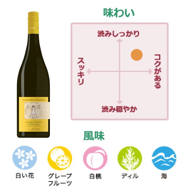 キャンティのエリアにある彼らの自園からの生まれる、珍しい内陸のヴェルメンティーノです。とは言え土壌は大量の海洋生物(特に貝類)の化石を含んだ特徴的なもので、地中海からの涼しい風が届くエリア。その良さはこのワインが放つフレッシュな柑橘系や白桃を連想させる香りからも伝わってきます。トスカーナらしい厚みのある果実と、それを支える心地よい酸味が特長の、バランスの良い辛口白ワインです。