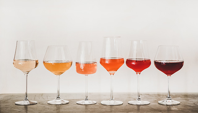 色調からわかる事は当然ワインの色タイプです。濃い赤だったら赤ワインですし、ピンク色だったらロゼワイン、黄色だったら白ワインです。しかし、これも面白いところがあり、赤ワインがだんだん薄くなっていったらロゼワインになるわけですが、その境目には明確な決まりがありません。出来てから少し時間が経ったロゼワインと、ピンクの果皮のぶどうからつくったオレンジワインはそっくりな色をしている場合もあります。