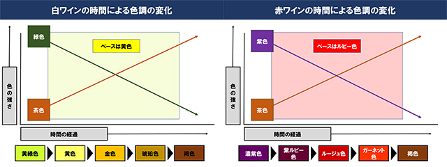 ワインは常に変化していくお酒です。香りや味わいの変化についてもいずれお話したいと思いますが、外観もつくられてからの時間経過と共に変化していきます。上に白ワインと赤ワインの時間の経過による色調の変化の図を載せています。見て頂くと時間と共に減る色と増える色がある事がわかると思います。