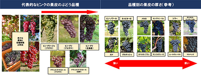 元々のぶどう品種が持っている色調もワインの色合いに影響を与えます。例えば上の左側の写真には、果皮がピンクのぶどうが幾つか写っています。一般的にはピンクの果皮のぶどうはそのままプレスして搾汁し、白ワインにされる事が多いです。搾ってすぐに果汁と果皮が分離された場合には、果皮の影響はワインの色には出ない事も多いのですが、完熟して果皮の色の濃いぶどうを原料にした場合や、醸造の過程で果汁と果皮とが接触している時間が長い場合には、出来上がったワインにうっすらと赤の色素が入り、肌色やごく淡いピンク色になる場合もあります。また、このタイプのぶどうを早めに摘んで果皮のピンク色が少ない状態でワインにした場合、水の様な透明に近い色になる事もあります。同様に、黒ぶどうからつくられる白ワイン(一般的にブラン・ド・ノワールと呼ばれる)も外観に赤の色素を感じる事が多いです。