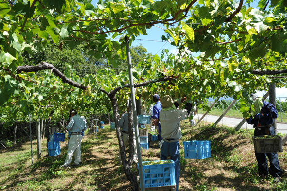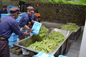 収穫は、全て人の手で大切に摘み取りますが、1つ1つのぶどうを必ず観察して、もしも病気になった部分などがあれば、それを取り除きながら丁寧に収穫作業を進めていきます。
