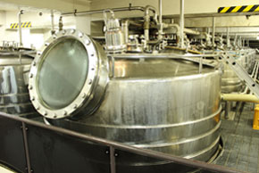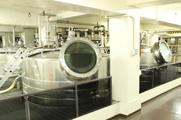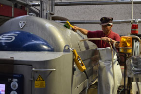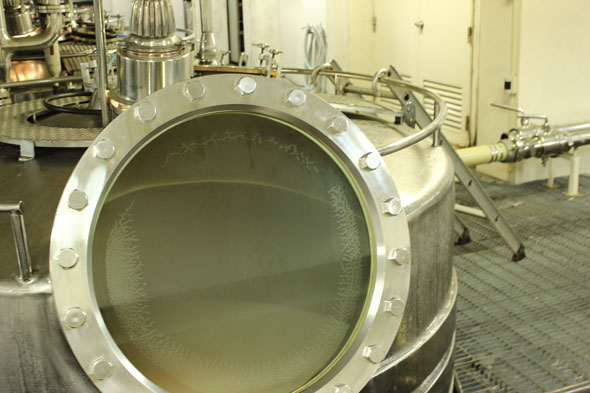 この日は8tのリースリング・フォルテを仕込みましたが、プレスした果汁は一旦1つのタンクに入れて1晩以上置くことで「清澄化」します。果肉や細かな皮など発酵にとって好ましくない様々な成分を沈殿させて、上澄みの果汁だけを発酵させるための前段階のこの準備を「清澄化」といいます。その時の果汁の状態によってどれくらい置くのかは変わってきますが、品質部門のスタッフがタンク内の果汁の濁度を分析して、判断します。そして、上澄みの果汁だけを発酵タンクに移してから培養した酵母を投入し、温度コントロールをしながら発酵を見守っていきます。発酵はぶどうの糖分をアルコールと炭酸ガスに分解していくのですが、その際に熱を発生させます。特に果実の香りを大切にしたい白ワインでは温度が上がると香りも失われてしまいます。そこで、ステンレスの発酵タンクの登場となるのですが、この発酵タンクは実は2重構造になっており、発酵中のワインが発する熱を外周に回ったパイプの冷却水で奪うことにより低温で発酵させてワインの香りを大切にした仕込みを行なうことができるのです。