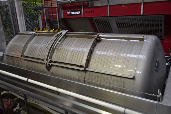 そして、プレス機に送られたぶどうからは自然と果汁が滴り落ちてきますが、さらにプレス機で果汁を搾ります。プレス機は横に長い円筒の形をしていて、中で風船が膨らむことによってぶどうが内壁に押し付けられて果汁がプレスされるという構造になっています。一度にギュッと絞りきるのではなく、風船が膨らんである程度プレスしたら一旦風船がしぼみ、円筒の中に空間が生まれるので、円筒を回転させることによって、ぶどうをほぐしてから、また風船が膨らんでぶどうをプレスするという動作を繰り返します。プレスする圧力をどれくらいに設定するのか、何回繰り返すのか、それぞれのぶどうの状態を見て、また、求めるワインの品質設計を考慮に入れ、ワインメーカーたちは都度判断していくことになります。