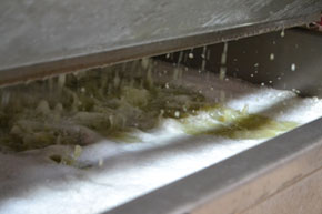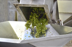 ぶどうは、「果梗(かこう)」という実の根元にある小さな茎の軸で連なって房の状態になっています。リースリング・フォルテの仕込みでは、その果梗からぶどうの果粒だけを外してあげます。「除梗機」の中にあるカゴと呼ぶ格子状の筒の中で2重らせん構造の棒がついた金属の軸が高速回転するトンネルをぶどうの房が通過する間に、ぶどうの実の粒が果梗から落とされて下のパイプに落ちて「プレス機」に送り込まれます。その一方で、残った果梗はトンネルの出口からどんどん勢いよく飛び出してきます。出てくる果梗は、ものの見事に実が外されていて、トンネルの出口に立って果梗が飛び出してくる様子を見ているのはおもしろいのですが、果汁も飛び散ってくるので長くは居られません。