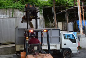 ぶどうの入った「舟」はフォークリフトで持ち上げられ、スタッフの手慣れた運転でバックで進みながら、ぶどうを除梗機に入れる受け入れ口である「ホッパー」のところに運ばれて、さらに高く持ち上げられた舟が回転することによって、ぶどうは一気にホッパーに投入されます。