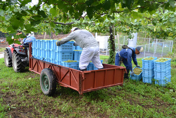 そして、収穫したぶどうは、下のぶどうが上のぶどうの重さでつぶれないようにコンパクトなコンテナに重くなりすぎないように入れて、畑の数箇所にまとめてコンテナを積み重ねて置きます。それをトラクターの荷台に手で積み込んで登美の丘ワイナリーの麓エリアの醸造棟に下ろします。