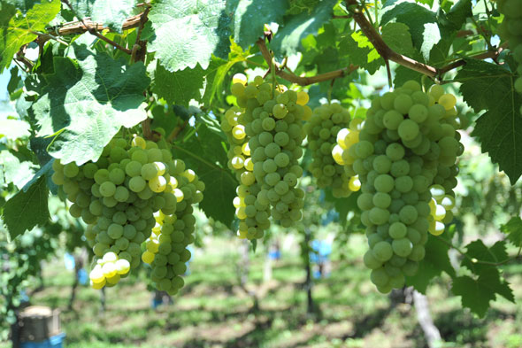 このリースリング・フォルテは、サントリーが甲州三尺とリースリングを交配させて開発した品種です。この品種の特長である爽やかな風味を活かすように、収穫のタイミングは酸味を重視して判断します。そういう意味で、ワイナリーの自家ぶどう園の中でも収穫タイミングが最も早い品種といえます。