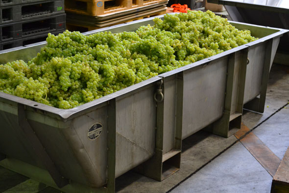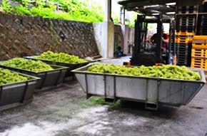まず、リースリング・フォルテの仕込み作業の最初は、収穫時のコンパクトなコンテナから「舟」と呼ばれる大きなステンレス製の容器にぶどうを移しかえることから始まります。かつては、コンテナのぶどうを直接「ホッパー(後述)」に投入していたのですが、作業の効率とスタッフの安全確保のために現在の方式に変更しました。