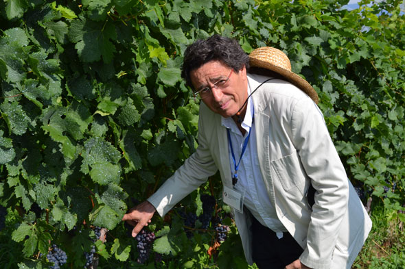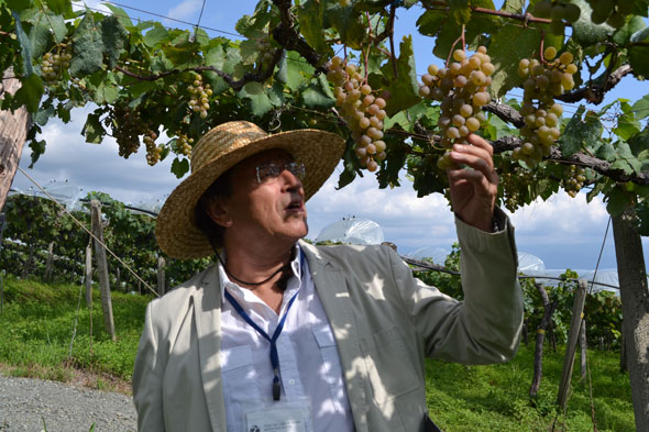 そして、2010年にOIV(国際ぶどう・ぶどう酒機構)に品種登録された甲州種のぶどう畑でも、初めて見る甲州種ぶどうに興味津々で、まだヴェレゾン前で着色していない状態でしたが、ぶどうの房の大きさや実のつき方を観察されていました。