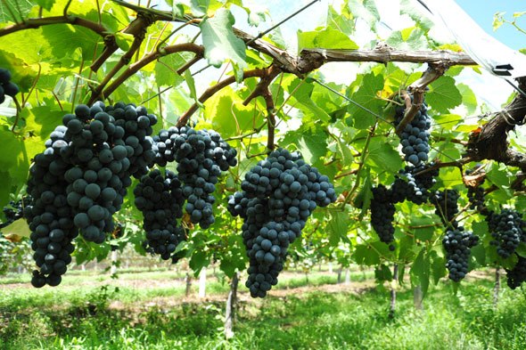 また、ビジュ(Bijou)とはフランス語で宝石、ノワール(Noir)は黒を意味します。つまり「ビジュノワール(Bijou Noir)」とは、「黒い宝石」という意味で、今年2015年のビジュノワールの果実の粒は色素が濃く、「ブルーム」と呼ばれるぶどうの粒の表面を薄く覆う白い粉の間から見える果皮の色はまさしく「黒い宝石」という名前がぴったりの印象です。