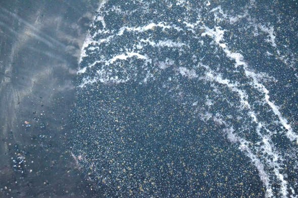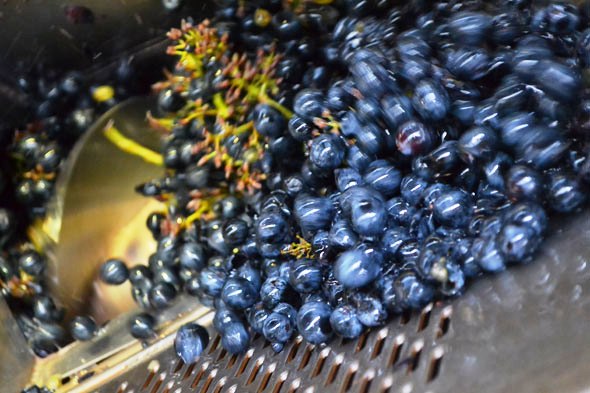 いつものように「舟」に集積されたビジュノワールのぶどう果は、フォークリフトで運ばれて、除梗機に接続するホッパーに順々に投入されていきます。そして、どんどん除梗機に投入されていくビジュノワールを見ていると、まさに「黒い宝石」の名前のように輝いて見えます。