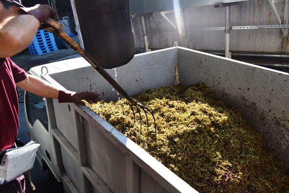 除梗機で除梗した果実は発酵タンクに送られますが、一方の除梗された果梗はチューブを通ってトラックの荷台にワサワサと投入され積み上げられていきます。これはまた場内で有機堆肥にしていくこととなります。