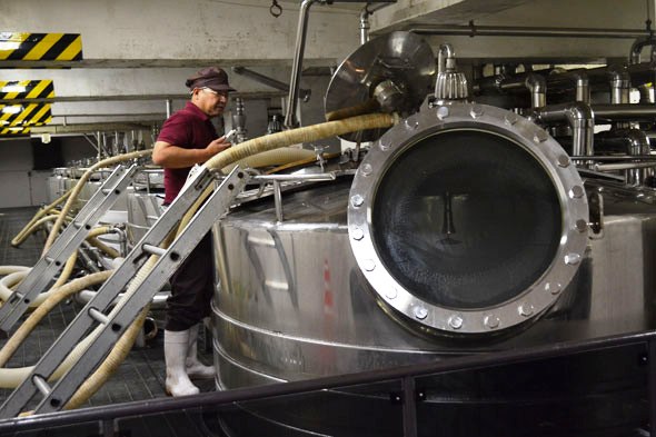 この日のビジュノワールは、登美の丘ワイナリーの発酵室の、向かって左側のタンクに移送され発酵していきます。これは、登美の丘ワイナリーのツアーにご参加いただくお客様に、その発酵の様子をご覧いただけるようにとの醸造Gのスタッフの配慮でもあります。非常に数多くの品種に加えてさらに産地別・畑別に分かれたり、数多くの発酵タンクの中でも容量や機能を駆使し使い分けして仕込み作業が多岐に渡っていく中でも、醸造スタッフはお客様に対するキメ細やかな気遣いをしてくれています。その姿勢はもちろんワインづくりに対しても同じで、赤ワインとしての発酵の状態を常に見て、目指すべき品質設計のために、それぞれのワインの状態に応じた発酵管理をキメ細やかく行なっていくことになります。それも後日レポートさせていただきたいと思っています。