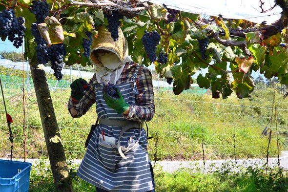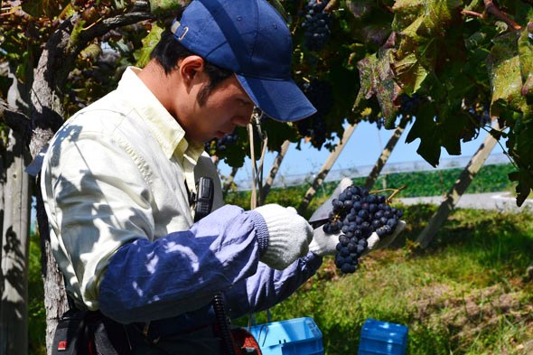 前日の棚仕立ての区画と異なり、垣根仕立てでは腰より低い位置のぶどうを収穫します。あるスタッフは立ったまま、あるスタッフは腰につけた「おったま下駄」というバスケットボールを椅子代わりにして収穫を進めていきます。