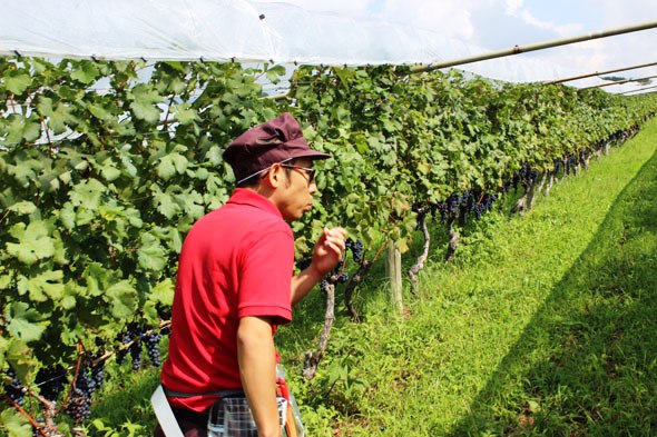 棚仕立てで栽培している区画のメルロでは、雨よけにトンネルを設置しているので、ぶどうがトンネルの下に列になってつながっています。観光農園でよくあるぶどう狩りでの棚仕立てではぶどうがあちこちになっているのと比べると、きちんと1列にぶどうが並んでくれているので、収穫は列にそって移動していけばいいのですが、傾斜地にあるため棚と地面の高さが上下しますし、やはり自分の肩の高さより高い位置のぶどうを切るのは負荷がかかります。しっかりと選果も行ないつつ、ずっと収穫作業を進めます。