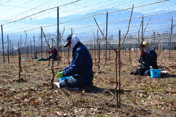 今、登美の丘ワイナリーでは場内のぶどう樹の剪定作業がほぼ終了し、あと1つの区画を残すだけとなっています。