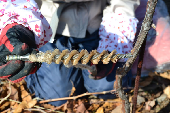 そして、最後に専用のブラシをかけてあげて、ぶどう樹をきれいにしてあげます。