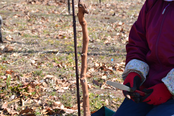 ぶどう樹の主幹の粗皮を剥ぐには、ヘラを使ってそっとそっと皮を剥いていってあげます。