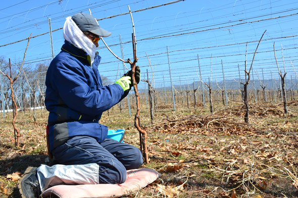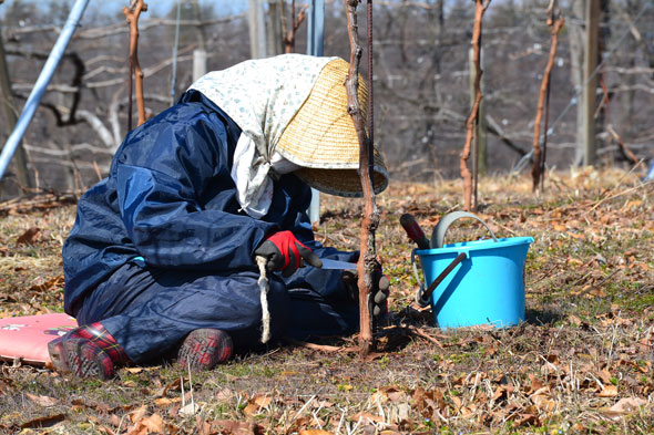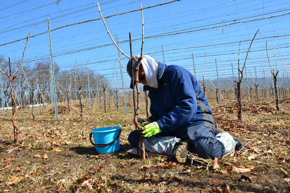 熟練したスタッフでも1本のぶどう樹にかかる時間は、およそ20分前後。本当に根気のいる仕事です。
