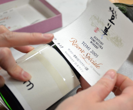 1本1本にシリアルナンバーを手書きし、手作業によるラベル貼り。和紙のラベルに、荻野丹雪氏による「登美」の美しい墨文字と「レゼルヴスペシャル」の金文字が上品で華やかです。