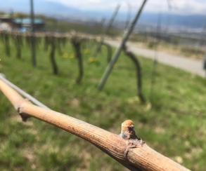 今年のシャルドネは4月9日に萌芽しました。昨年より8日早かったです。甲州はシャルドネに比べて少し生育は遅めですが、やはり順調に萌芽を始めました。