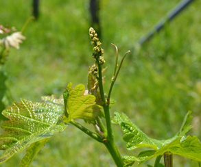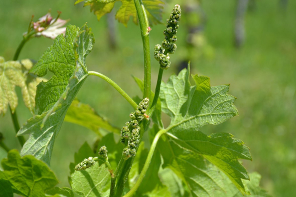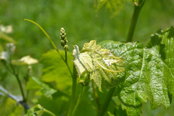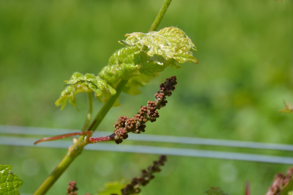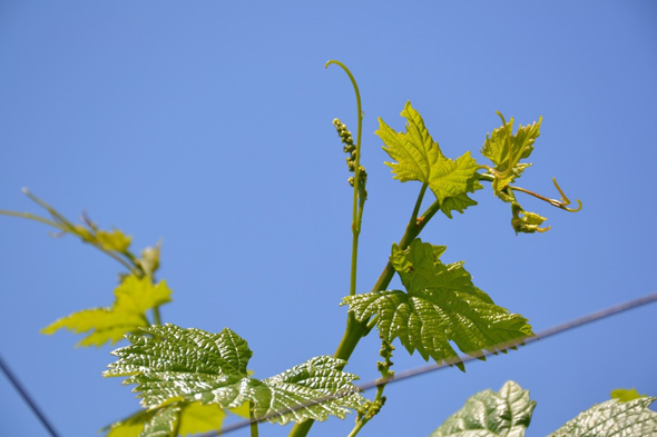 カベルネ・ソーヴィニヨンはさらに少し遅れて芽が膨らみ始めました。そして萌芽が始まってからは好天続きで、ぶどうはぐんぐん生育し、ゴールデンウィークにはすでに花穂が見られました。今年はもうすでに花穂が見られます。品種によって色や形がそれぞれ違います。