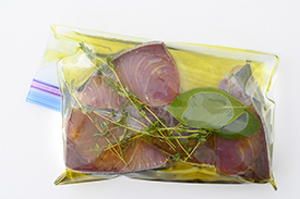 保存用ポリ袋に(1)を入れ、Aを加える。空気を抜くようにして口をとじる。