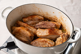 鍋にオリーブオイルを熱し、(1)を並べて全体にしっかりと焼き色をつける。一度取り出しておく。