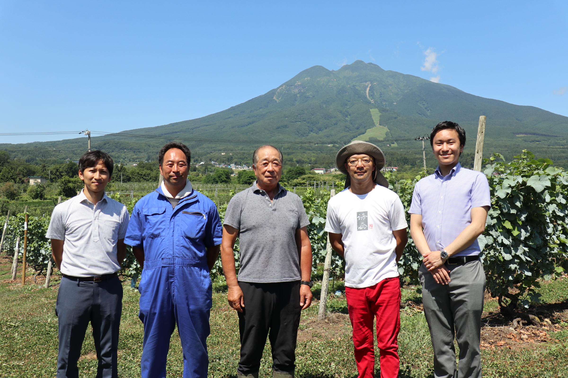 太田さんと木村さんの両名です。「津軽富士」とも呼ばれる岩木山の麓に位置する太田さんの畑。なんと言っても、この津軽の魅力は昼夜の寒暖差がしっかりとあるところです。この時期は、日中は30度を超えますが、夜になると20度近くまで下がり、少し肌寒いほど。また風が常に吹いていることで、ぶどうの酸もしっかりと保持され、フレーバーもゆっくりと成熟していくことで、高品質なぶどうが得られます。