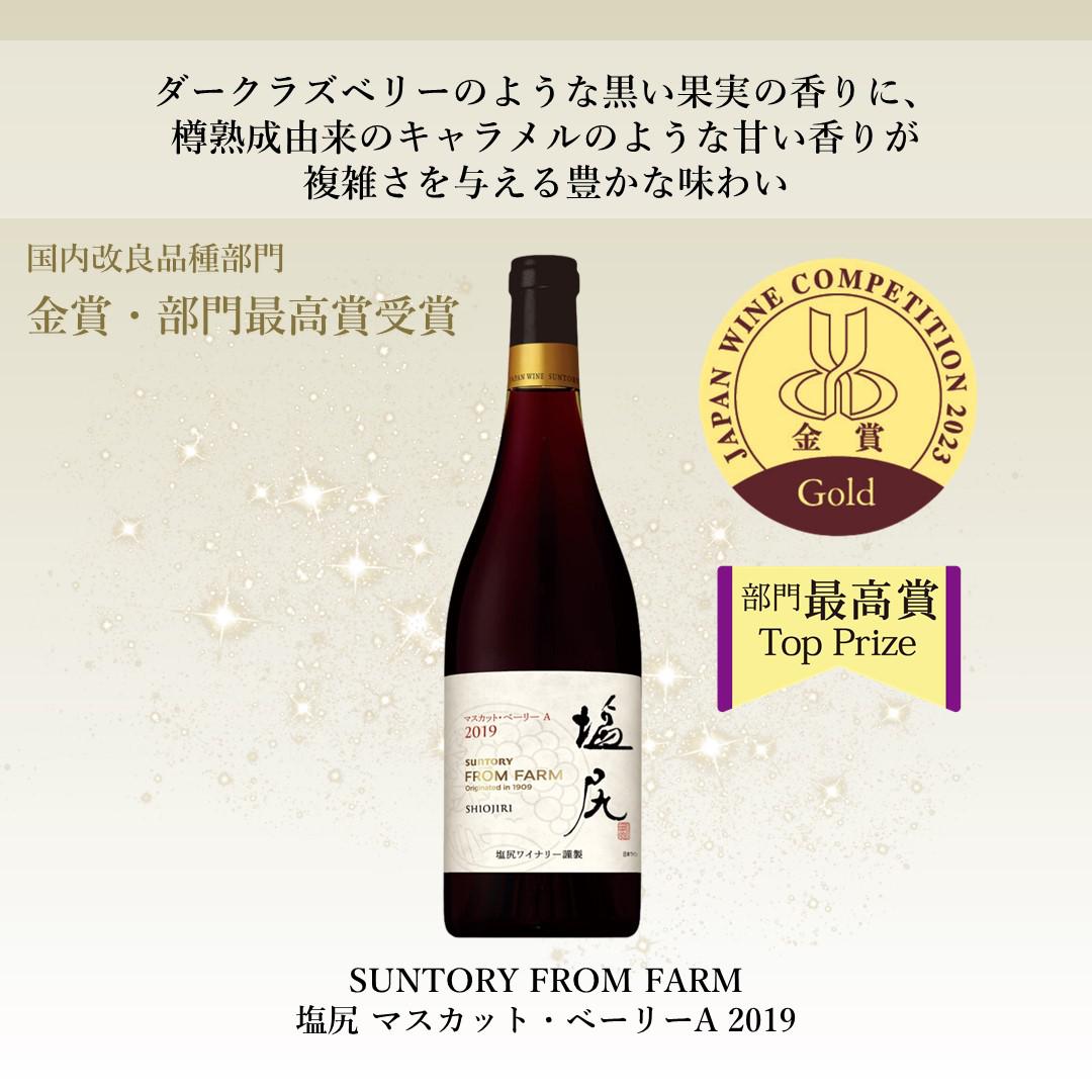まずは「サントリーフロムファーム 塩尻マスカット・ベーリーA 2019」ですが、今回の「国内改良等品種」において113品の出品があった中で唯一の金賞受賞アイテムであり、いかに厳しい審査の中、厳選されたものであるかという事がこの結果からもお分かり頂けると思います。