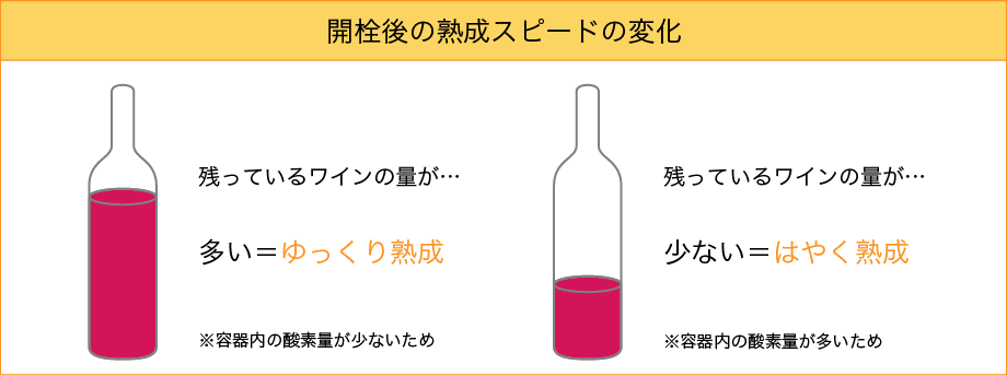 また、開栓後の熟成のスピードは、容器内に残っているワインの量にも左右されます。酸化熟成は容器内の酸素の量が多いほど速く進みますので、容器内のワインの残量が多いうちはゆっくりと進むのですが、ワインを飲み進めてワインの残量が減ってくると、急激に味わいが変化します。小さめの容器に移し替えて容器内のスペースを少なくする事で、この問題は解決できます。