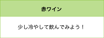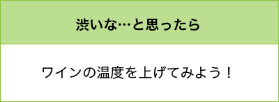 ●赤ワインを高めの温度で飲むのは、低い温度で飲んでしまうと、折角の香りがあまり感じられず(一般的に赤ワインの方が白ワインよりも香りの要素が多い)、渋みを必要以上に強く感じてしまうからです。なので、タンニンの少ないボジョレーヌーヴォーのようなワインは赤ワインでも少し冷やして飲むことが多いのです。